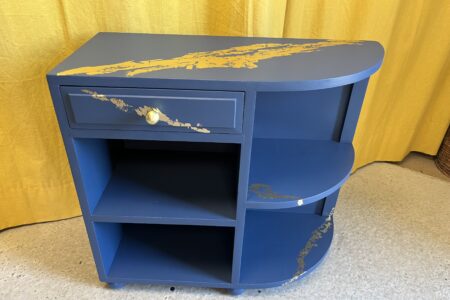 Cosy qui a pris du pep’s il est prêt à trouver sa nouvelle maison De couleur bleu boston, décor à la feuille d’or, protegé par un vernis incolore. Disponible à la vente chez Un Soupçon de Création Dimensions: Longueur 65 cm Hauteur 59,5 cm Profondeur 27,5 cm Prix: 95€